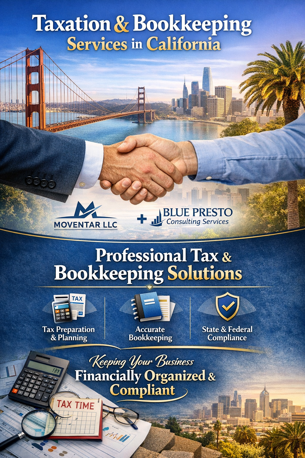 Through this strategic partnership, Moventar LLC is now able to offer comprehensive taxation and bookkeeping services to businesses of all sizes and industries operating in California. Blue Presto Consulting Services brings extensive experience in financial compliance, accurate bookkeeping, and tax-related solutions aligned with state and federal regulations.